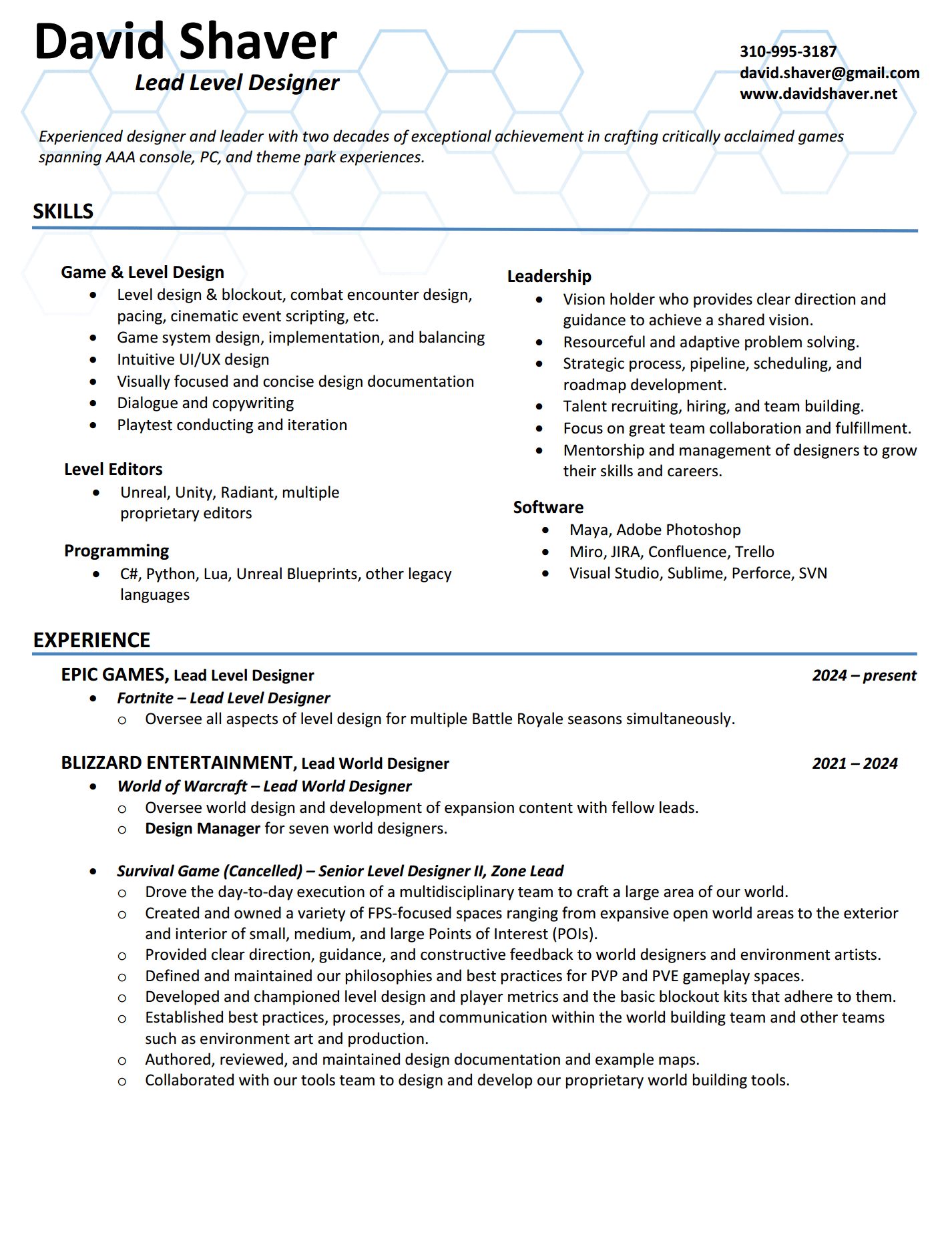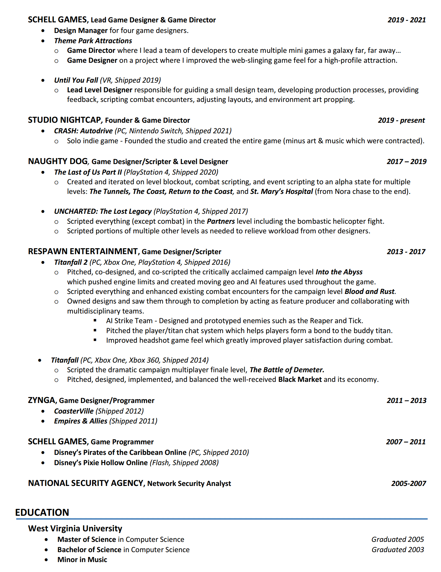 This wide variety of skills and experiences also help make me a better leader and mentor. I’ve been a discipline lead as well as a game director multiple times and received great feedback from my peers. I’ve also mentored other designers and helped guide several to fulfilling career goals. I strive to be empathetic and serve those I lead to help us all achieve greatness.