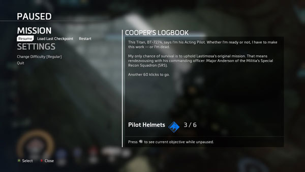 Pause Menu and Cooper's Logbook